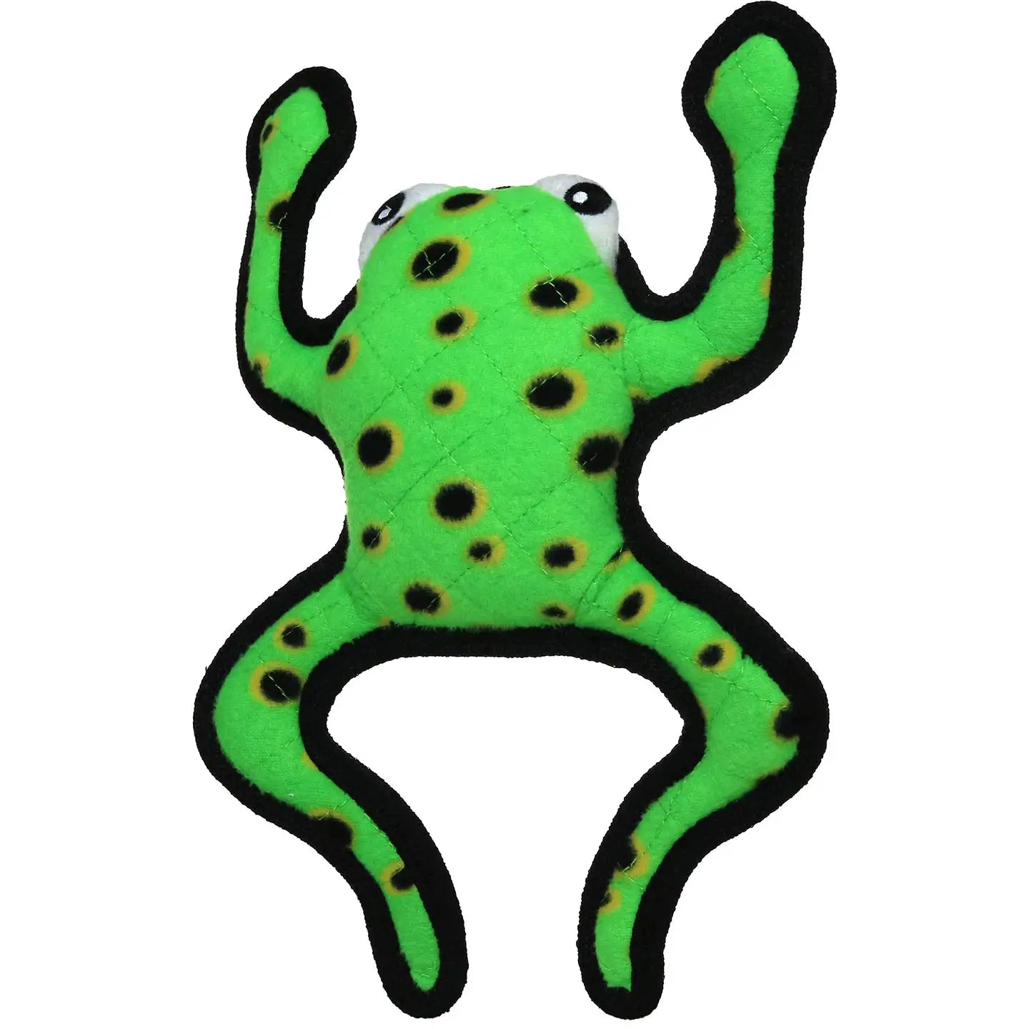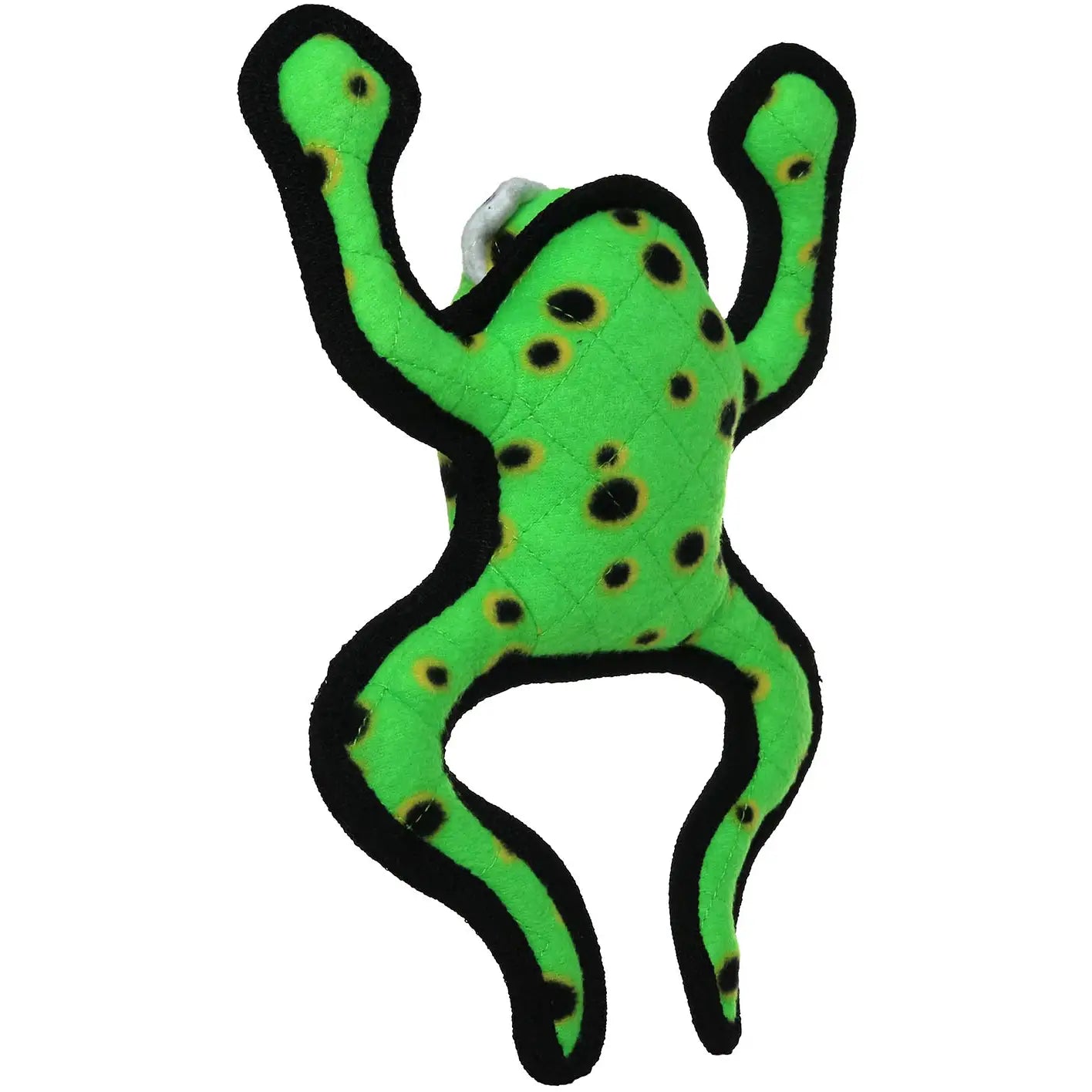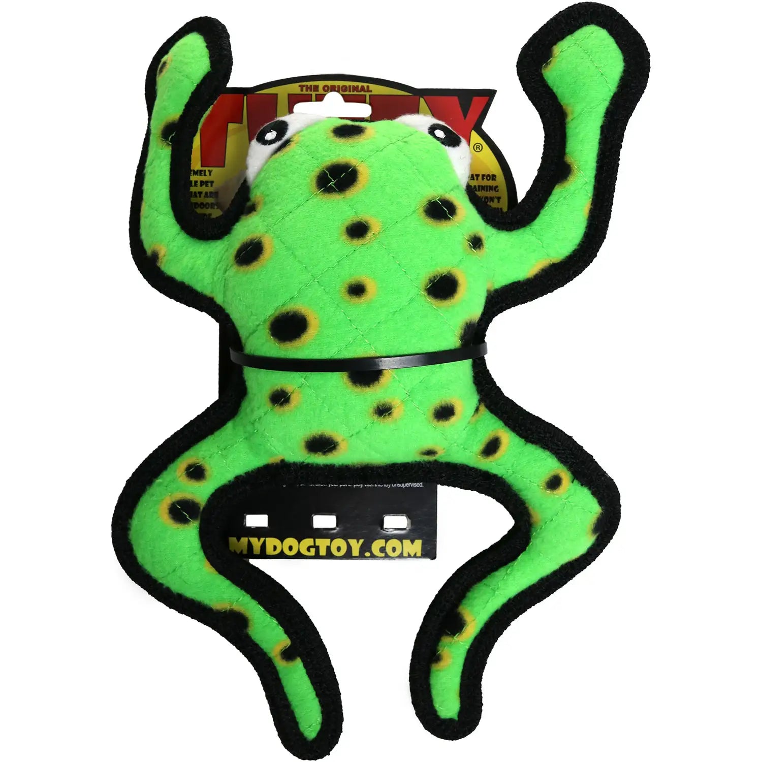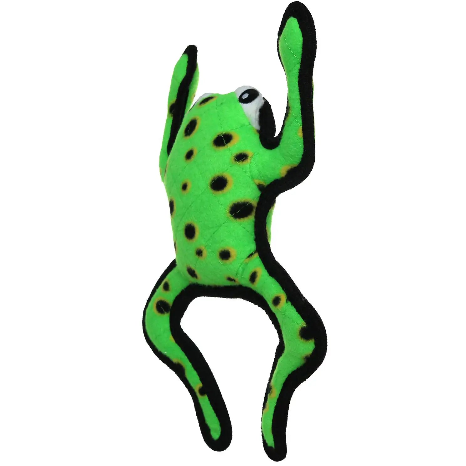 Tuffy Dog Toys Leaping Frog Dog Toy. Hop into nonstop fun with the Leaping Frog, part of the legendary Tuffy Barnyard Collection of tough plush dog toys. Built to outlast ordinary stuffed animals, this durable frog dog toy is perfect for games of fetch, tug-of-war, or even splashing around in the pool. Crafted with multiple layers of durable materials.