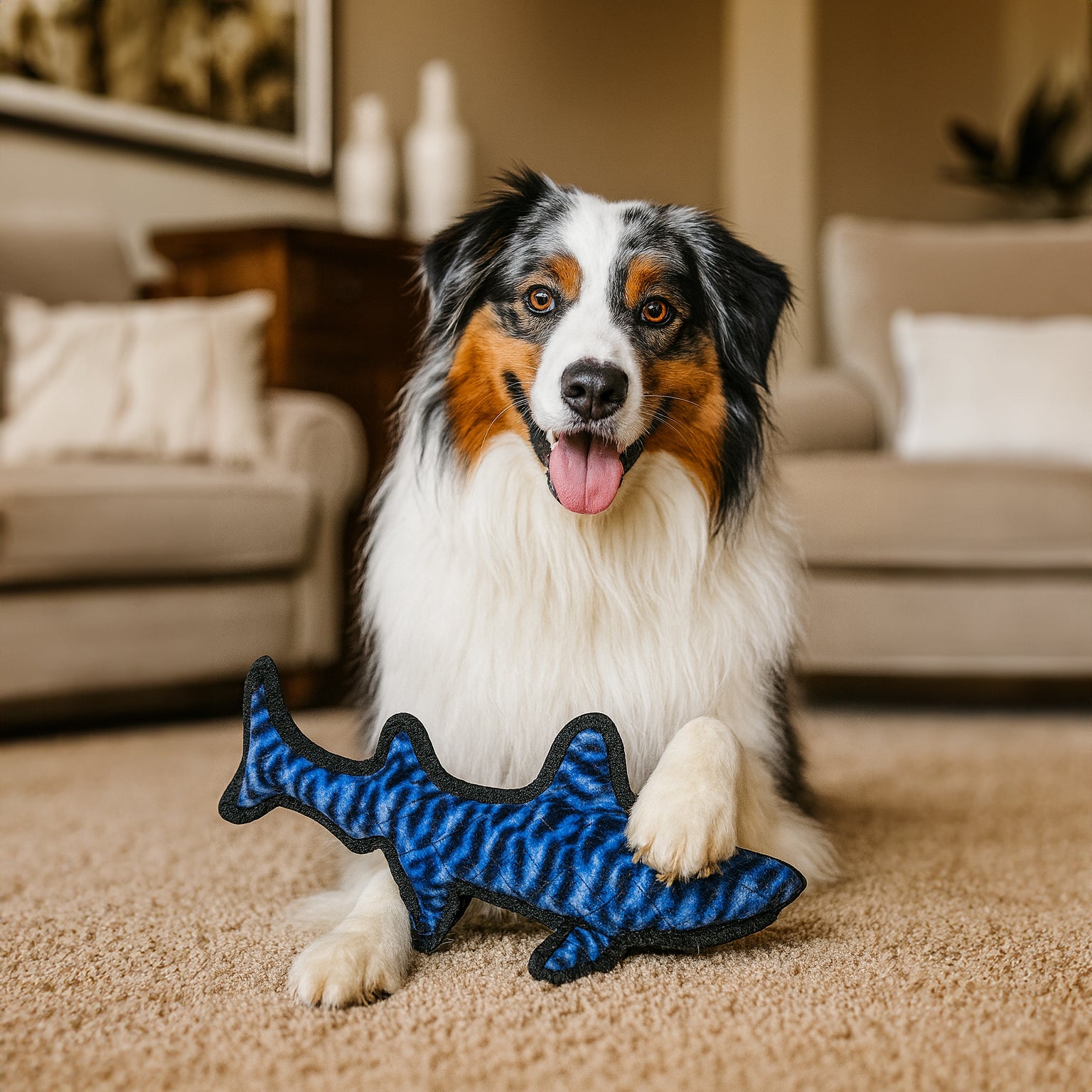 Tuffy Dog Toys Shack the Shark - Keep your legs up—Shack the Shark is making waves! This tough sea creature is perfect for dogs who love to fetch, tug, and whip their toys around. Built with Tuffy’s durable multi-layer construction and reinforced stitching, Shack is ready for hours of interactive play both on land and in the water. Soft edges make it gentle on teeth and gums.