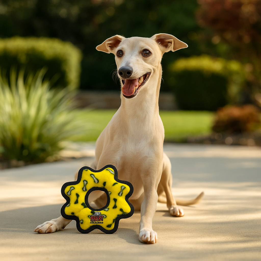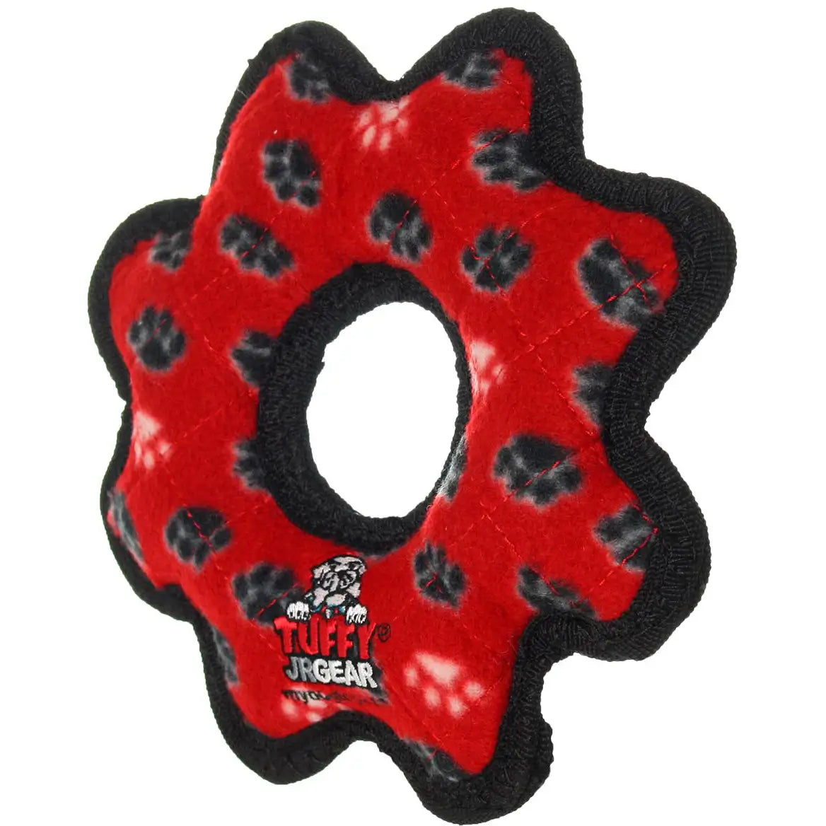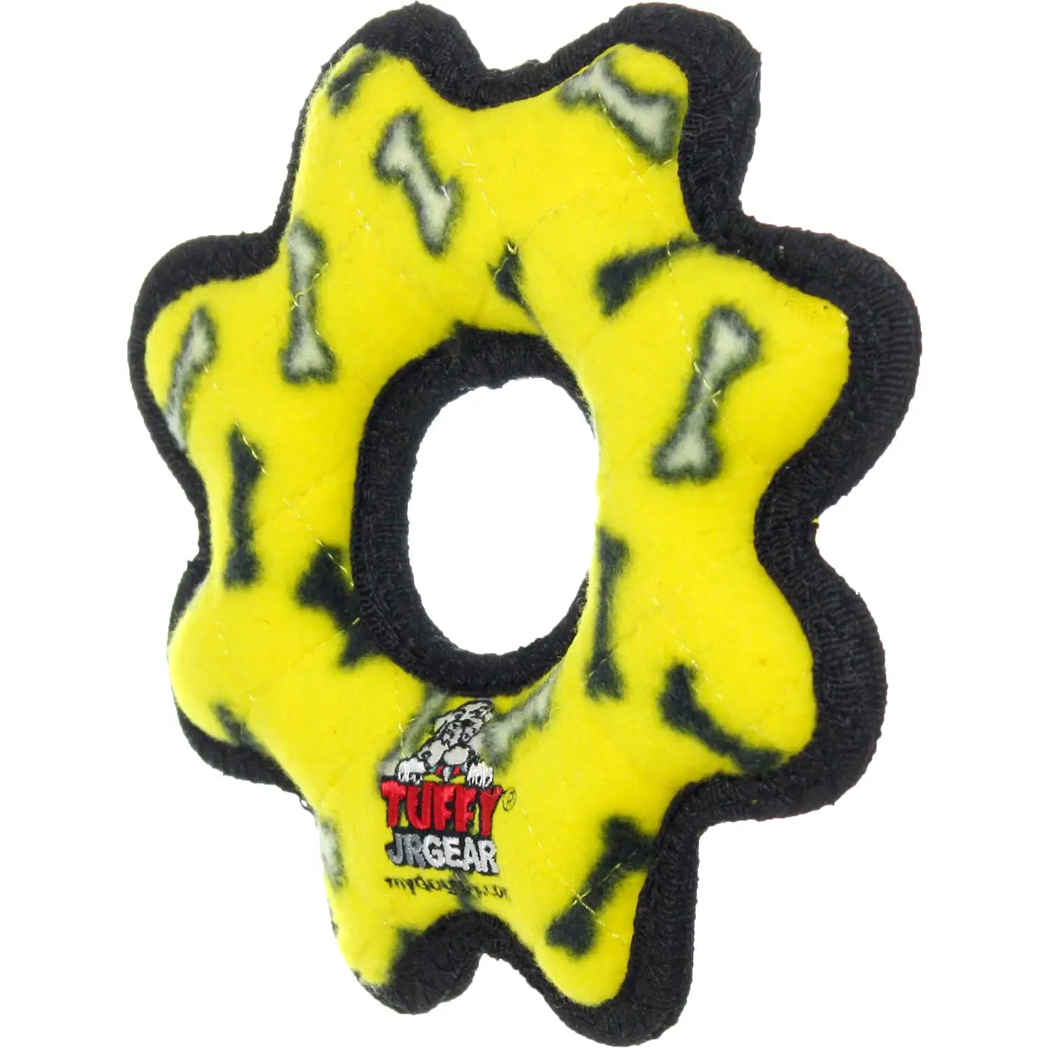 The Tuffy Dog Toy -  Jr. Ultimate Gear Ring is tough and long-lasting. It's great as a Frisbee, a tug toy, or for flyball training. The soft edges won't hurt gums. It has three built-in squeakers.