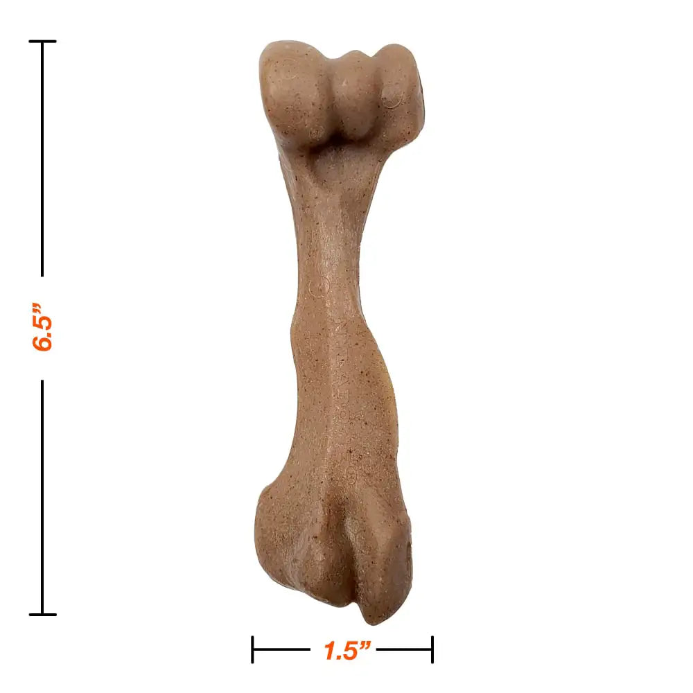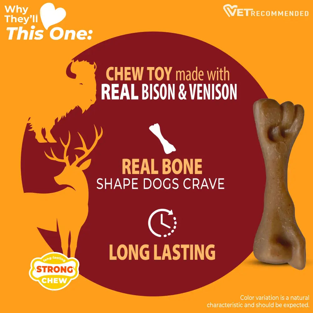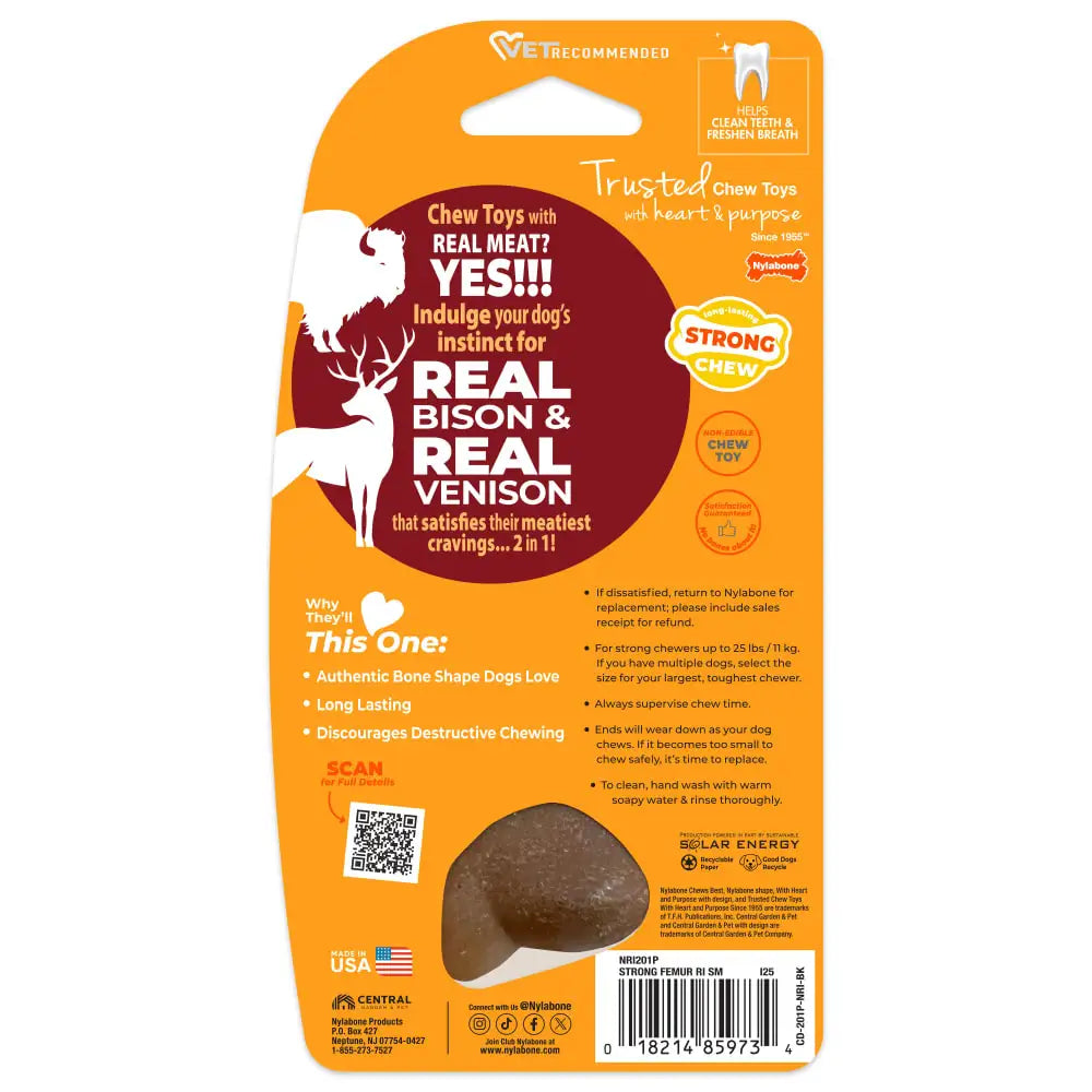Nylabone Strong Chew Femur Bone Dog Chew Toy. For dogs that crave the flavor of real meat and the satisfaction of a classic bone shape, the Strong Chew Femur Bone delivers long-lasting chewing enjoyment—without the mess. Made with real bison & venison flavor, this chew taps into your dog’s natural instincts while offering a cleaner, safer alternative to real bones.