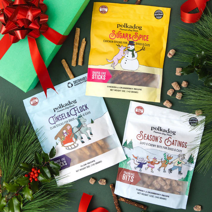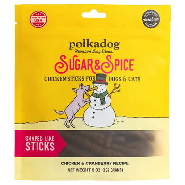 Polkadog Henny Penny Sticks – Holiday Edition! ’Tis the season for a little Sugar & Spice! Celebrate the cozy warmth of the holidays with these festive Henny Penny Sticks—handmade in small batches and packed with savory, slowly dehydrated chicken mixed with tart, antioxidant-rich New England cranberries. Crunchy, wholesome, and full of seasonal cheer, this limited-edition recipe is the holy grail of holiday goodness.