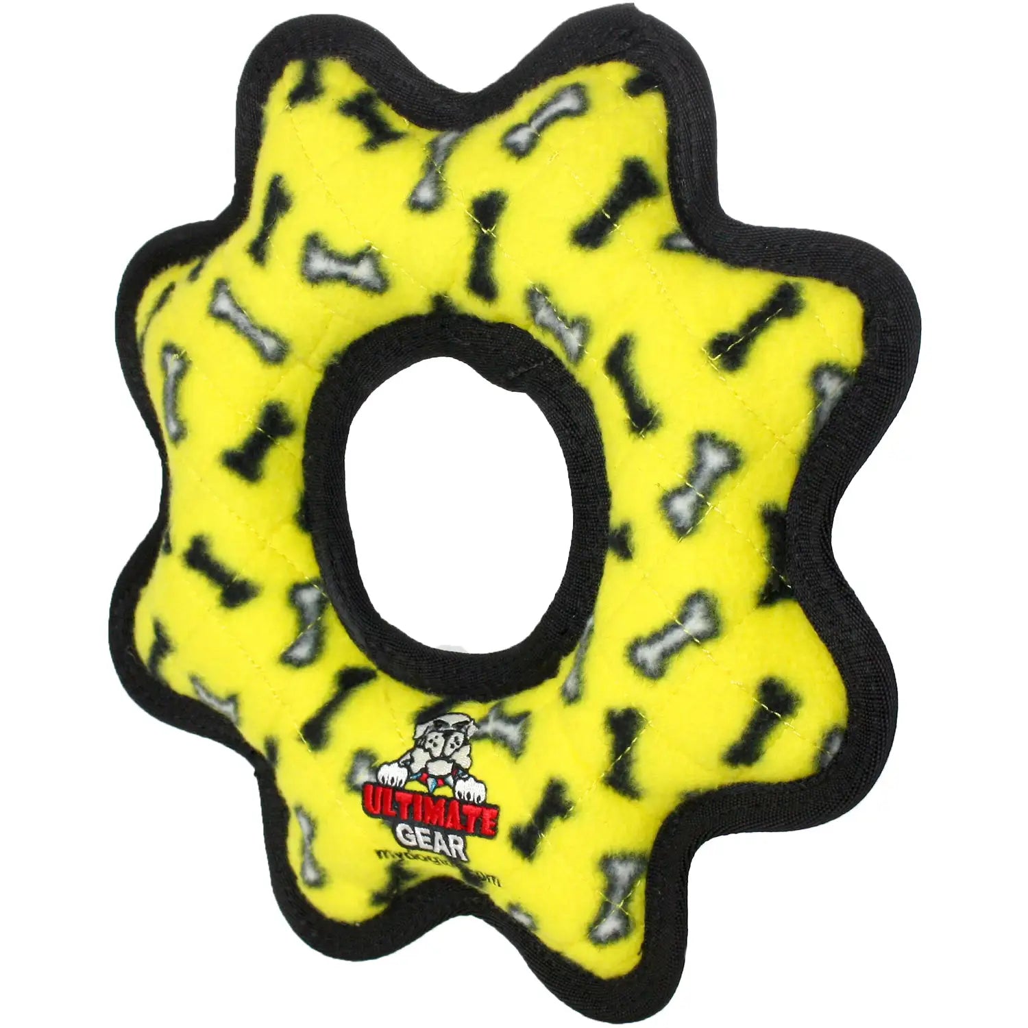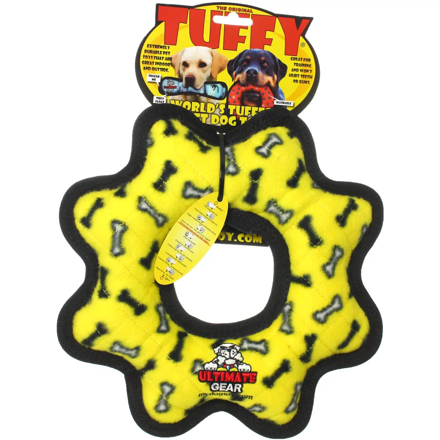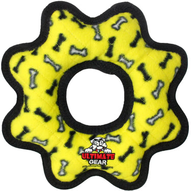 Tuffy Dog Toys Ultimate Gear Ring is a durable plush dog toy designed for interactive play. It can be used as a flyer or a tug toy, making it a great option for playtime with one or multiple dogs. This ring is also well-suited for flyball training and floats for water play. Soft edges are gentle on teeth and gums, while built-in squeakers help keep dogs engaged. Like all plush toys, it is not chew-proof and is best used during supervised play.