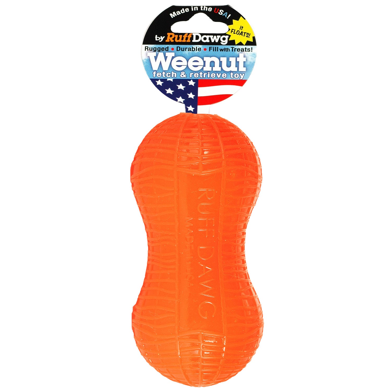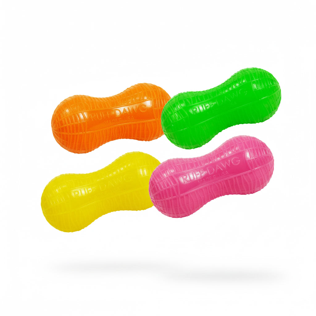 Ruff Dawg Weenut  -  Made for hours of exercise and fun. This Jr Peanut version includes a special lining that makes Weenut feel soft and rugged, not to mention bendable, making it the perfect toy for a good game of fetch or interactive playtime. Like the original Peanut, this junior version is textured, bouncy, floatable, and easy on teeth & gums. Proudly made in the U.S.A.