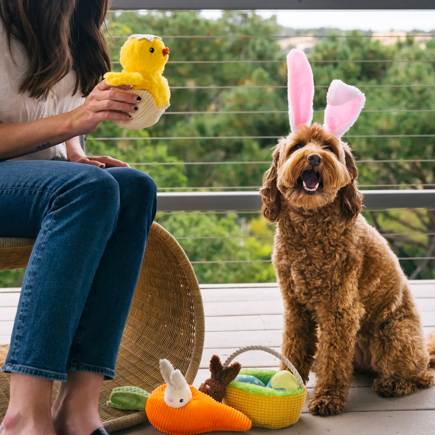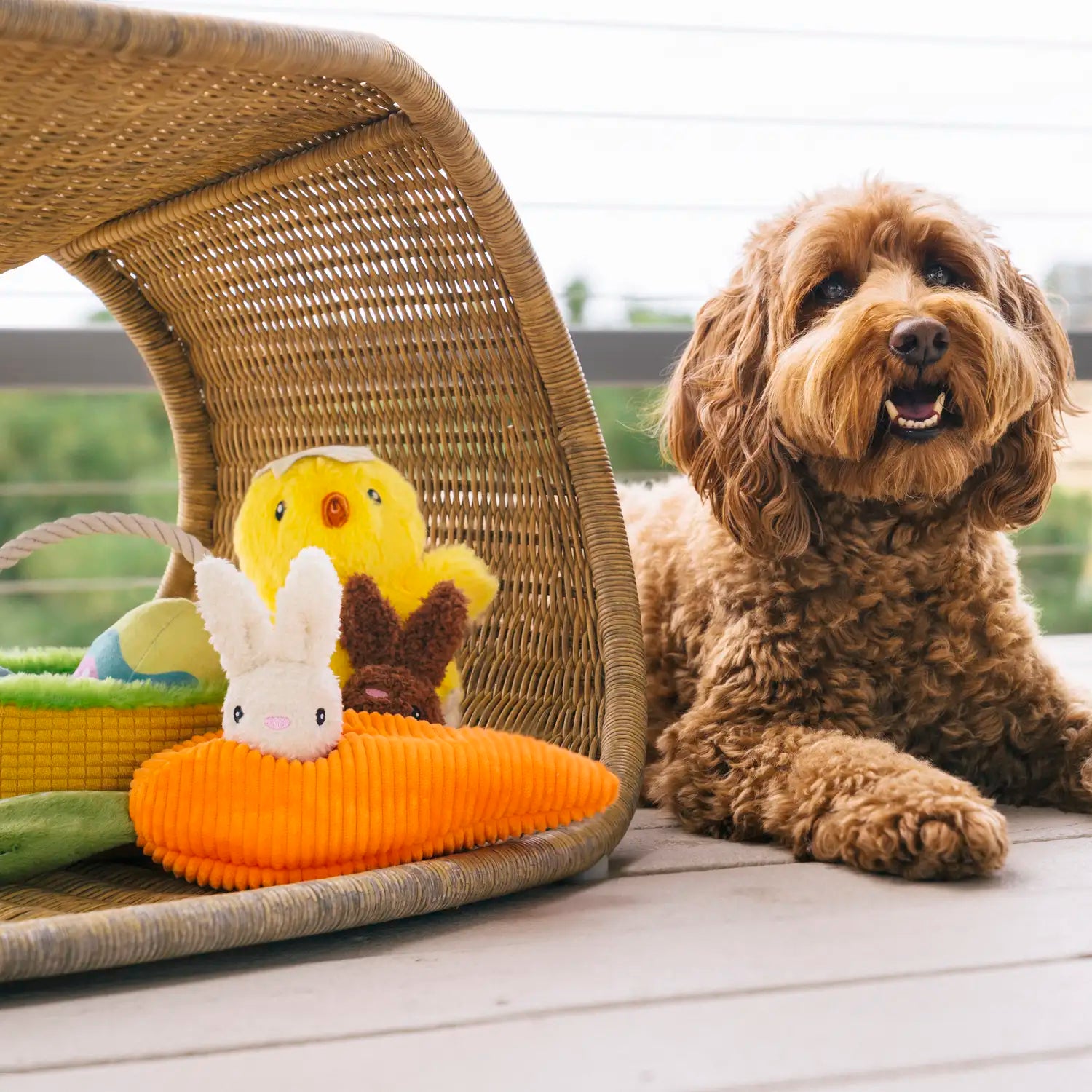 P.L.A.Y. Hippity Hoppity Chick Me Out Dog Toy. Enhance your pup’s playtime with the Hoppity Chick Me Out Toy — a fluffy little companion with an egg-stra special surprise. This charming chick comes nestled inside a removable crinkly eggshell, adding an interactive, sensory twist that keeps dogs curious and engaged.