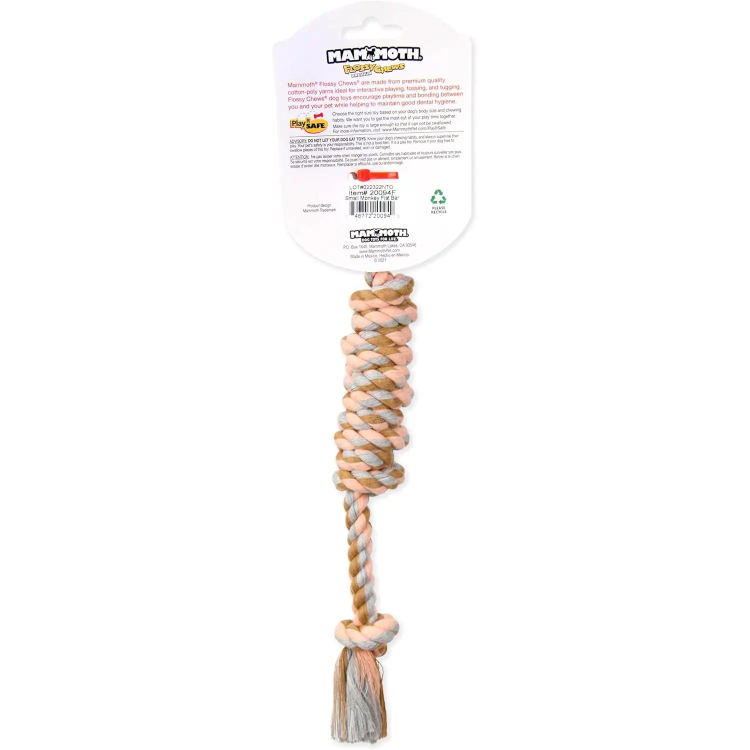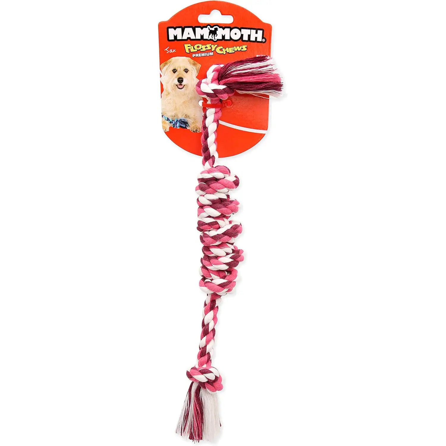 Give your pup a tough, dental-boosting way to play with the Mammoth Flossy Chews Monkey Fist Bar! Crafted entirely from strong, braided flossy rope, in two sizes (15" and 18"), this rope toy is perfect for fetching, tugging, and chewing. As your dog chews, the natural floss-like fibers scrub away plaque and tartar while gently stimulating gums for improved dental health. Over time, the rope strands loosen to help clean hard-to-reach areas—turning every play session into a natural teeth-cleaning routine. Built for durability and nonstop fun. (Colors vary.)