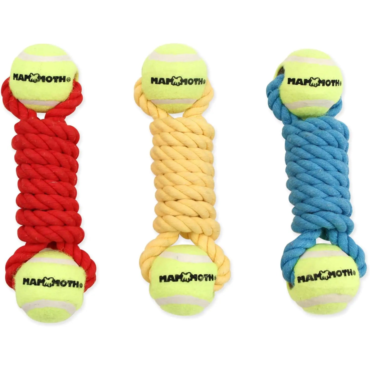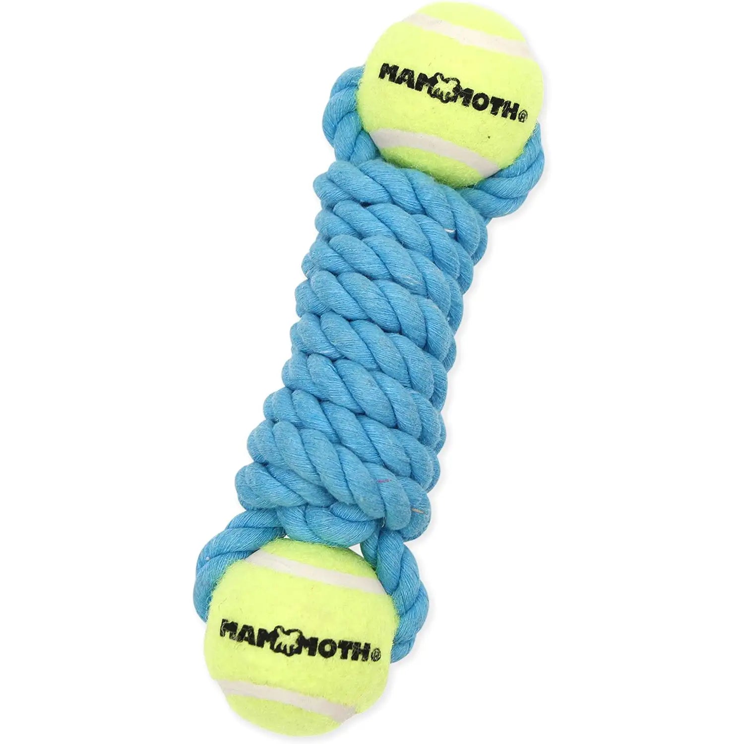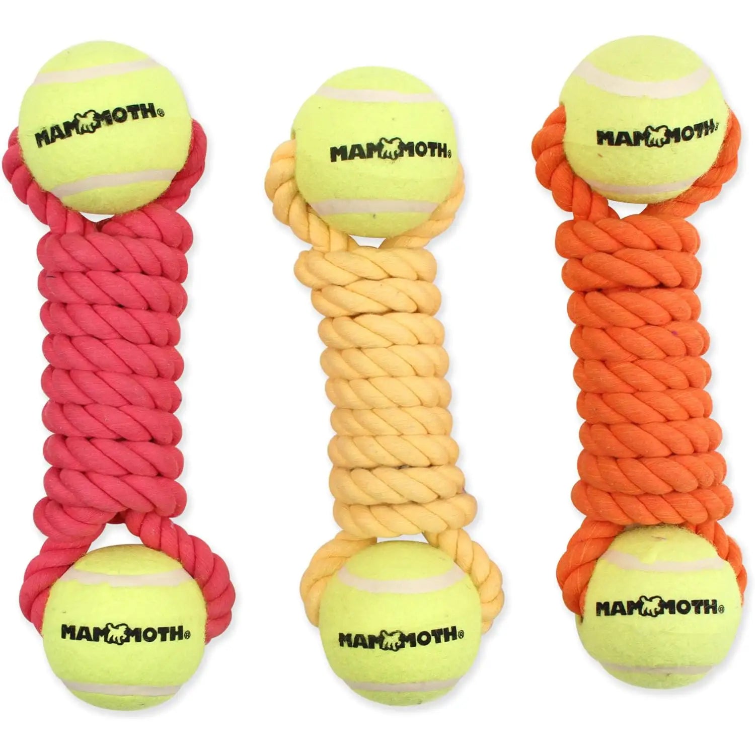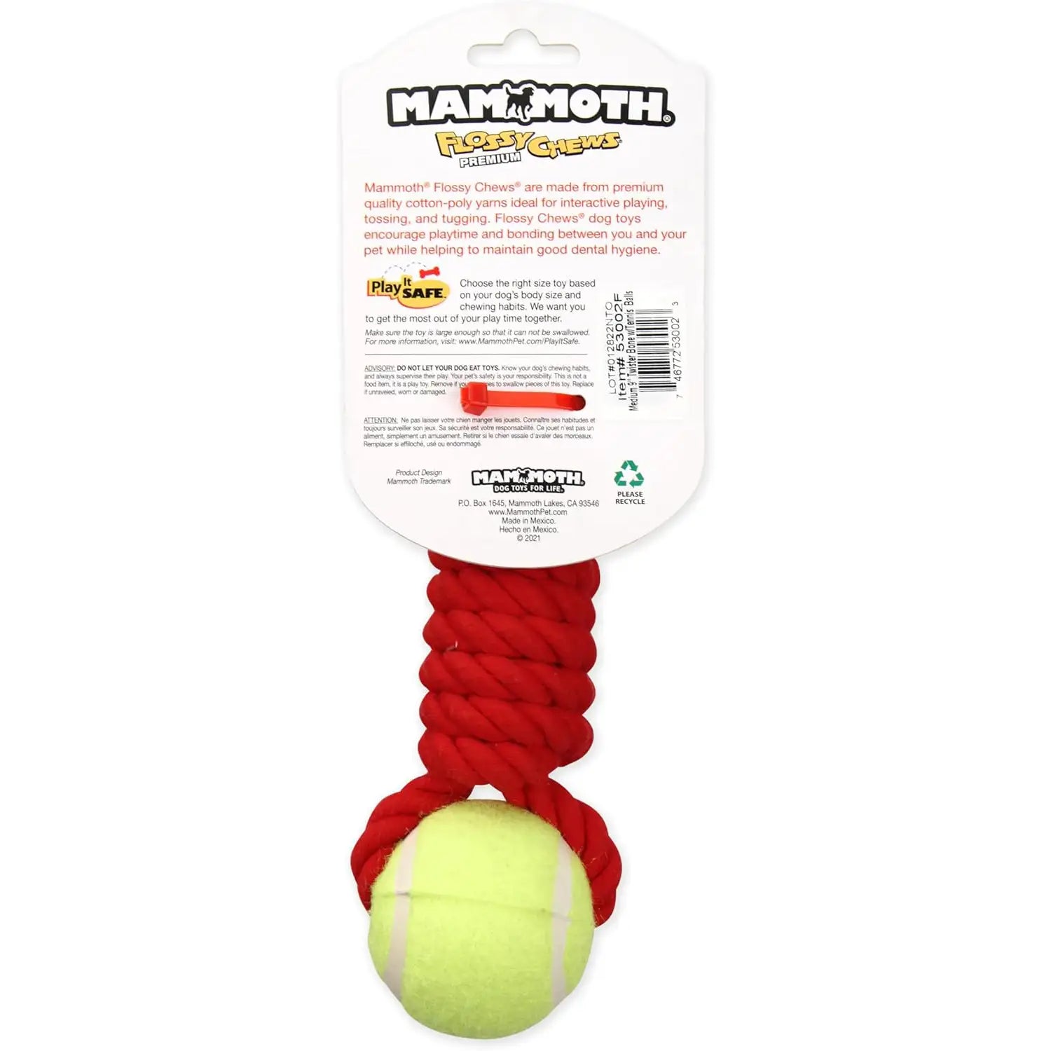 Mammoth Twister Bone with Tennis Balls. Made from premium poly-cotton rope fibers. Includes 2 Tennis Balls that dogs love. Rope fibers floss dogs' teeth as they chew & play. A great go-fetch toy. Perfect for medium breeds.
