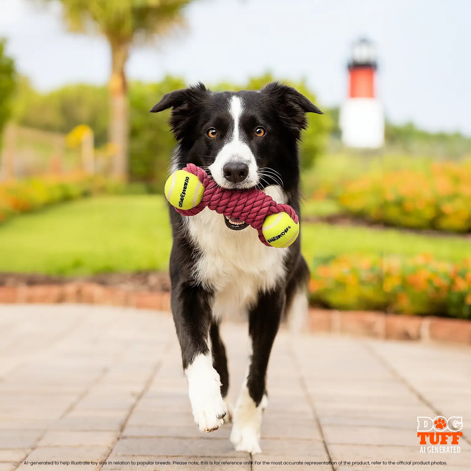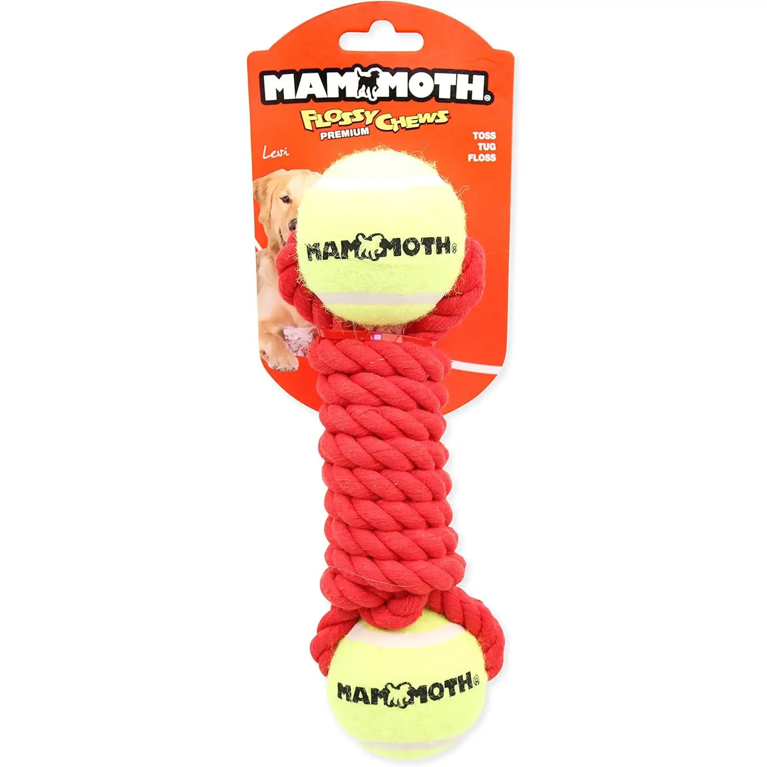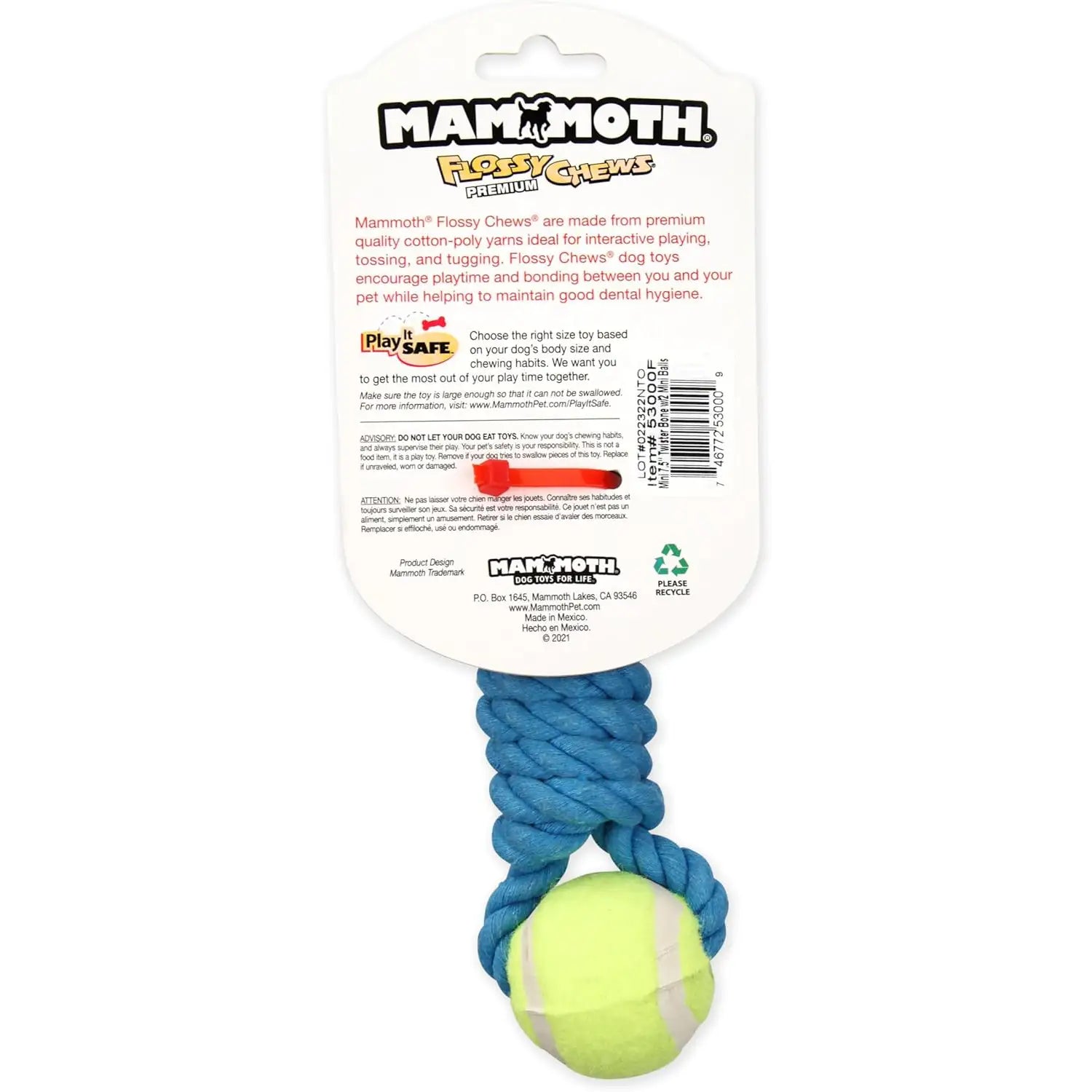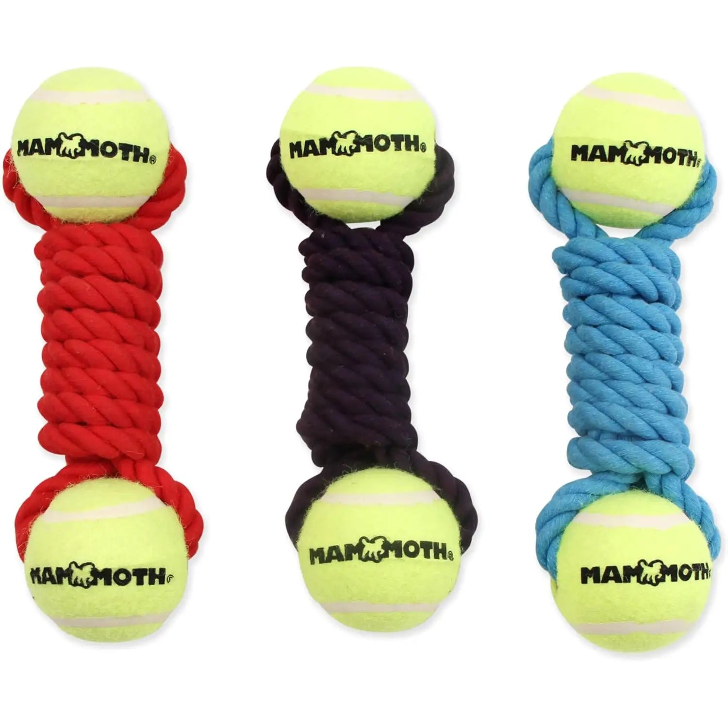 Mammoth Twister Bone with Tennis Balls. Made from premium poly-cotton rope fibers. Includes 2 Tennis Balls that dogs love. Rope fibers floss dogs' teeth as they chew & play. A great go-fetch toy. Perfect for medium breeds.