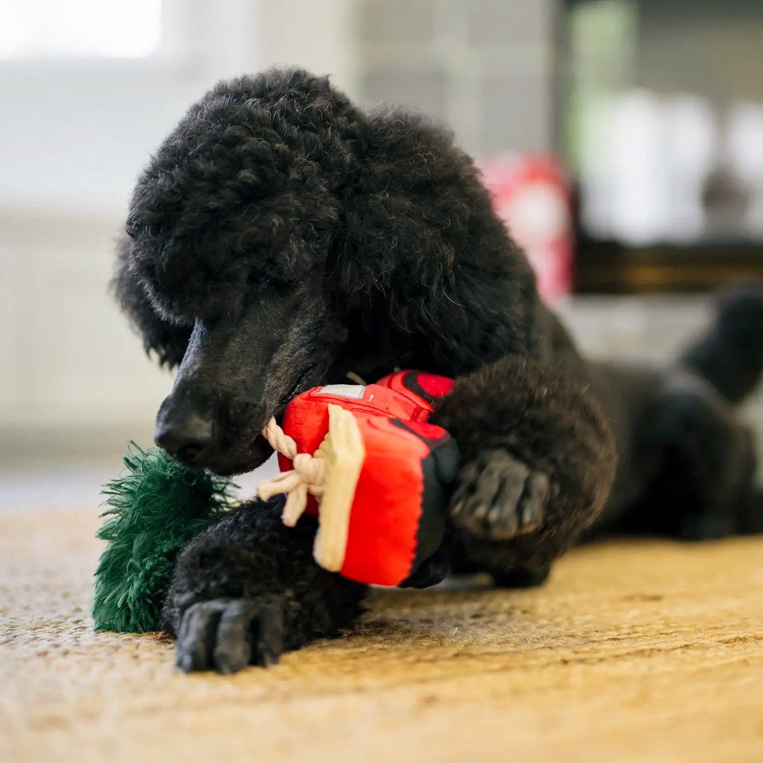 Pet Play Holiday Red Truck - Deliver festive fun straight to your pup! The Holiday Red Truck plush from P.L.A.Y. is ready to roll into playtime with holiday cheer. Shaped like a vintage red pickup carrying a Christmas tree, this squeaky toy combines festive charm with a durable, eco-friendly design your dog will love.