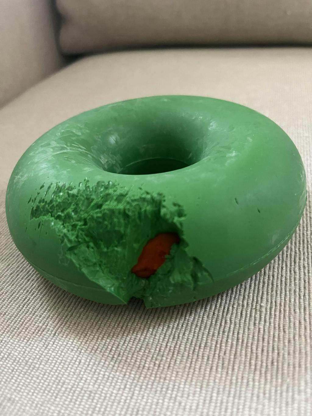 It’s a built-in safety feature found in all Goughnuts rings (green, orange, yellow). If your dog chews through the outer layer and exposes the red core, it’s time to remove the toy and request a free replacement.