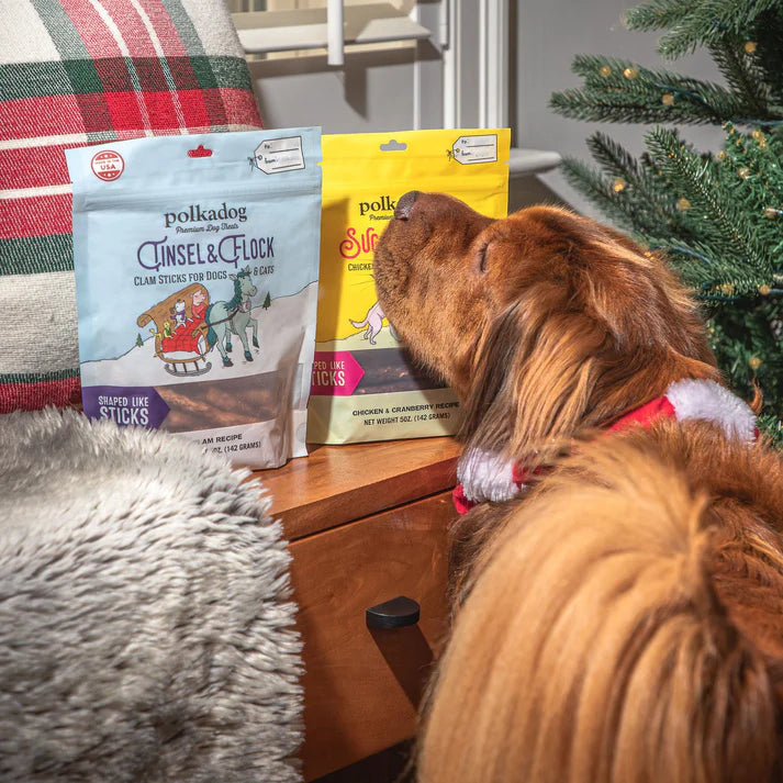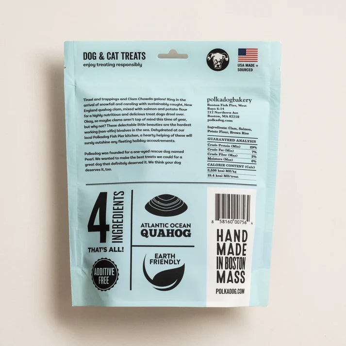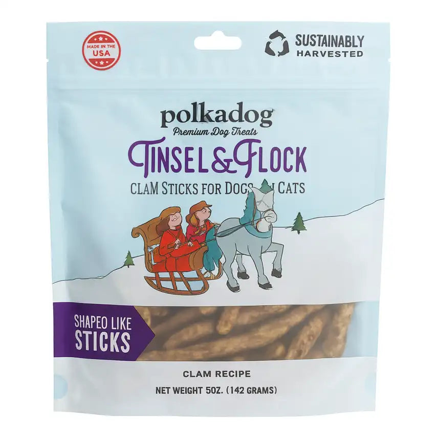 Polkadog Tinsel & Flock Treats - Polkadogs Clam Chowda Holiday Edition, Tinsel, trimmings, and Clam Chowda cheer! Celebrate the snowy season with these deliciously festive sticks made from sustainably caught New England quahog clam, blended with salmon and potato flour for a nutritious, mouthwatering treat. These hardworking (non-elfin!) bivalves bring big flavor and even bigger holiday spirit.