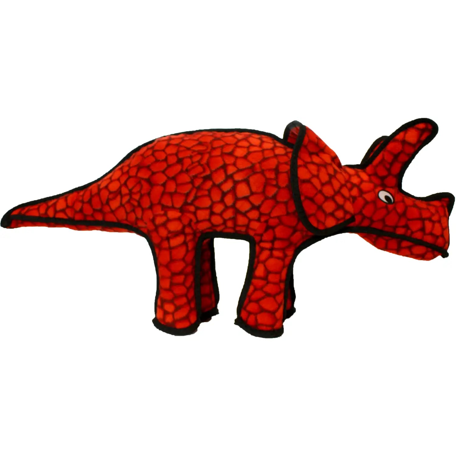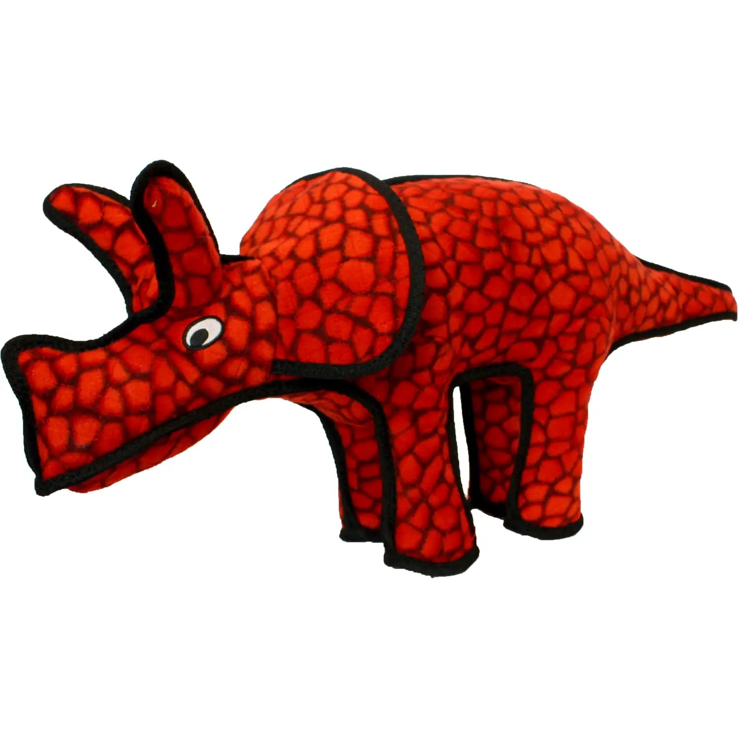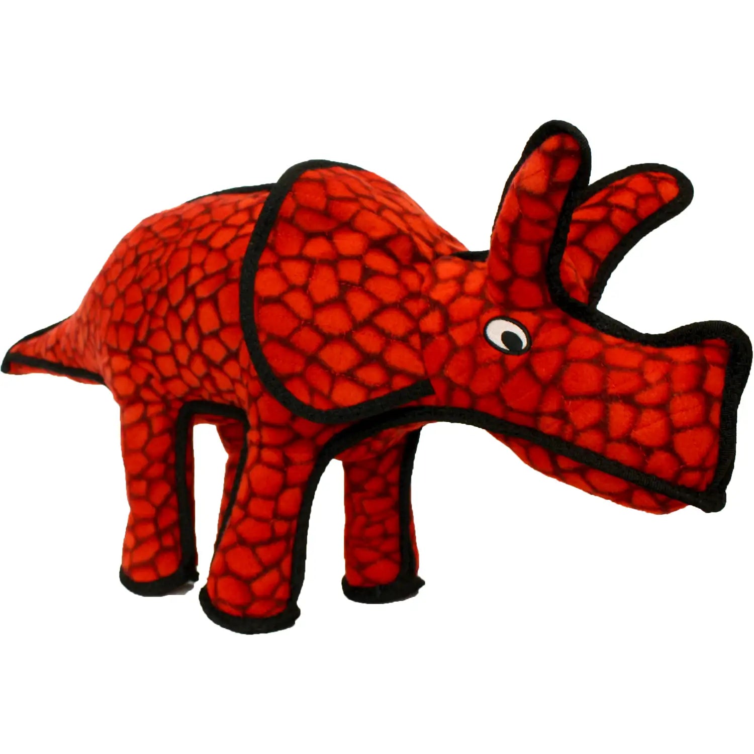Tuffy Dog Toys Marty the Triceratops - Along the shadows of the mountains walks a legend in armor plate protection. Allow your pup to set up a protective barrier and spare your plants from this menacing plant eater. This dog toy does not have squeakers. Marty is a BIG dog toy.  Great for interactive play with one or multiple dogs. Best for dogs who like to whip their toys and play tug for hours. Floats in water, and it’s machine washable, (air dry).