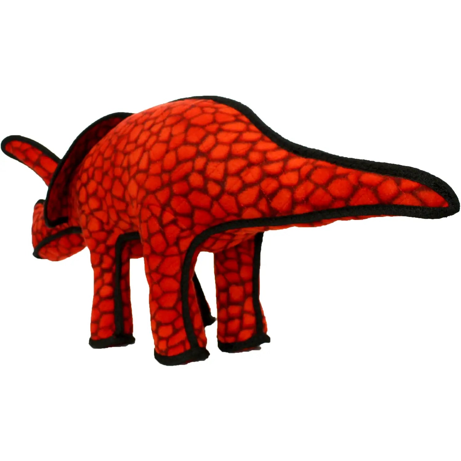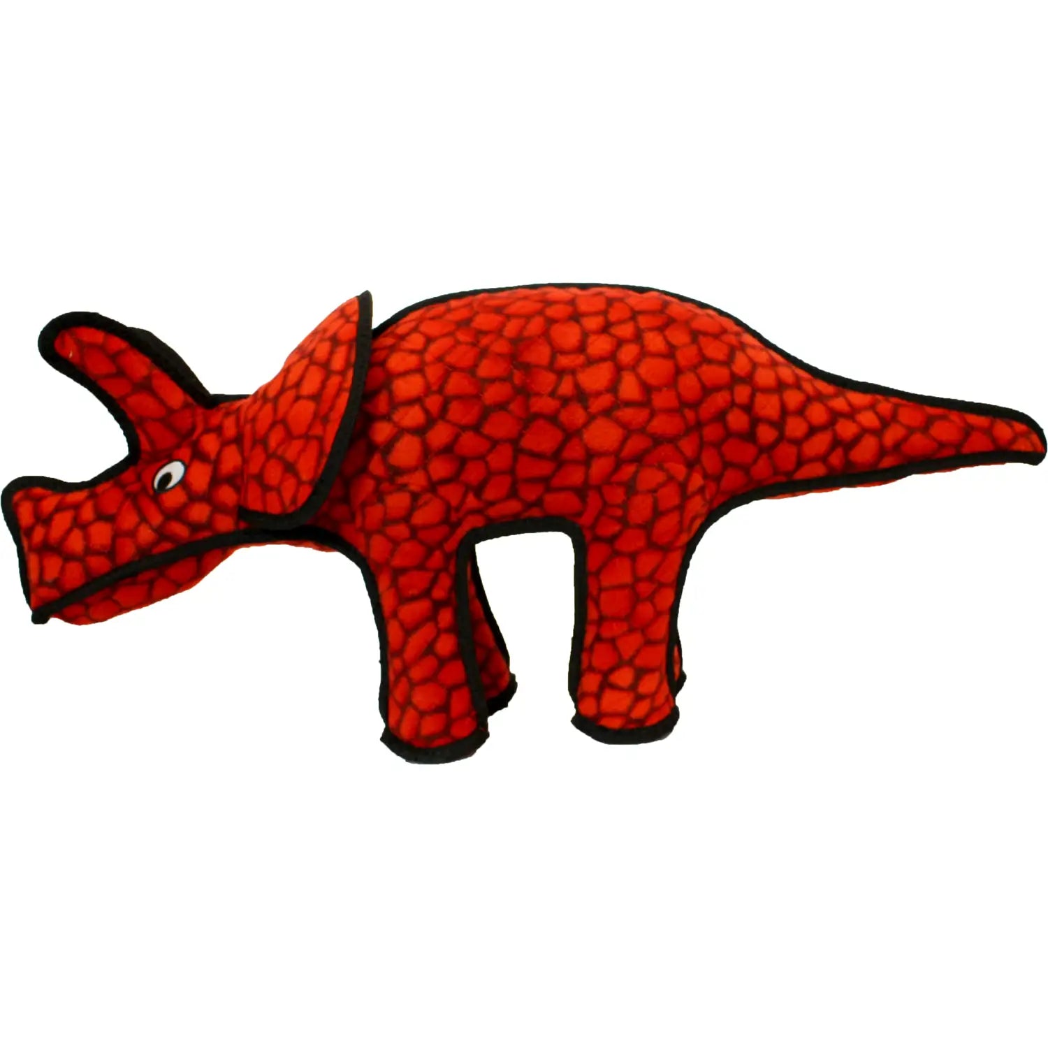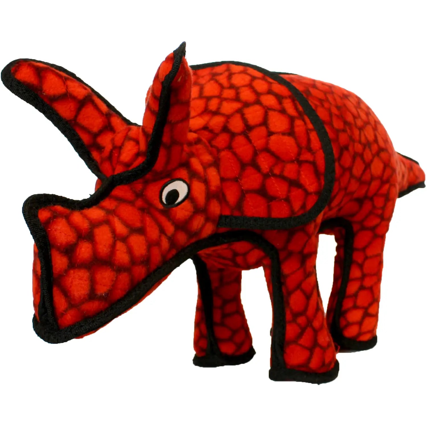 Tuffy Dog Toys Marty the Triceratops - Along the shadows of the mountains walks a legend in armor plate protection. Allow your pup to set up a protective barrier and spare your plants from this menacing plant eater. This dog toy does not have squeakers. Marty is a BIG dog toy.  Great for interactive play with one or multiple dogs. Best for dogs who like to whip their toys and play tug for hours. Floats in water, and it’s machine washable, (air dry).