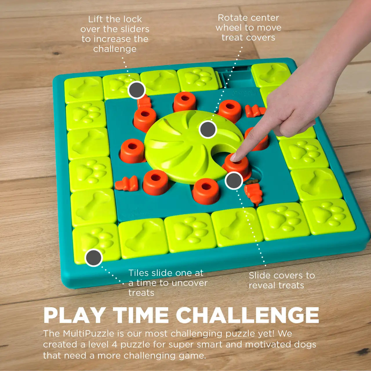 Nina Ottosson by Outward Hound MultiPuzzle Interactive Dog Puzzle Toy is the ultimate Level 4 challenge for dogs who have mastered the basics and are ready for the next level of mental stimulation. Designed for experienced puzzle-solvers, this advanced enrichment toy keeps dogs engaged as they tap into their natural hunting instincts to uncover hidden treats.