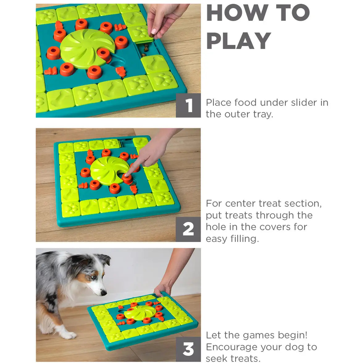 With multiple layers of play, treats or kibble can be hidden in both the outer and central compartments. Your dog will need to slide puzzle pieces in sequence to reveal rewards—creating a more complex, multi-step challenge that keeps them thinking, focused, and entertained longer. It’s perfect for reducing boredom, slowing down fast eaters, and providing serious mental exercise.