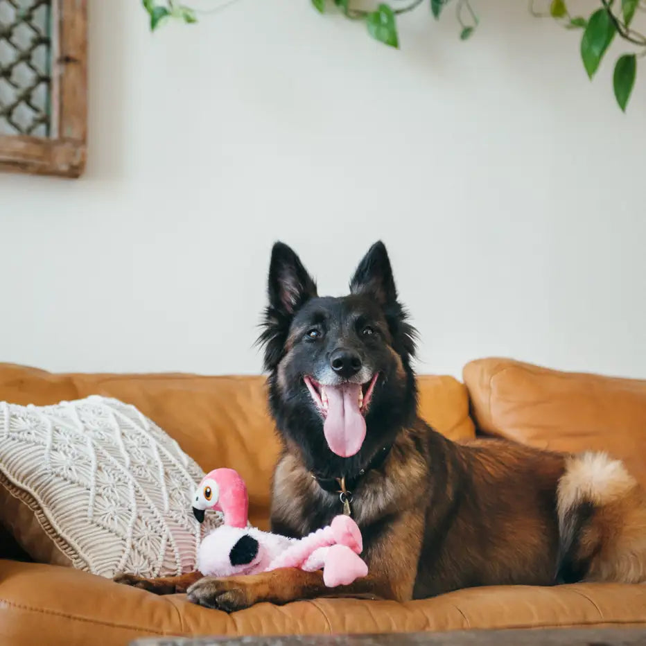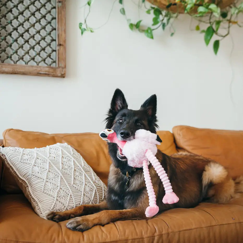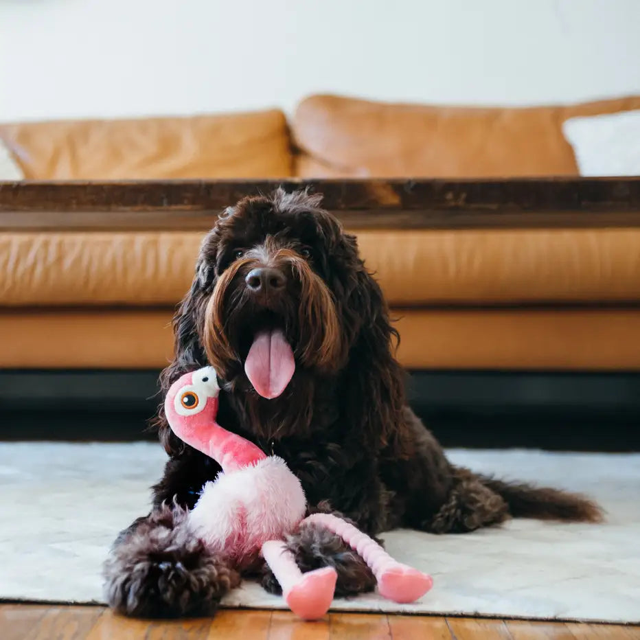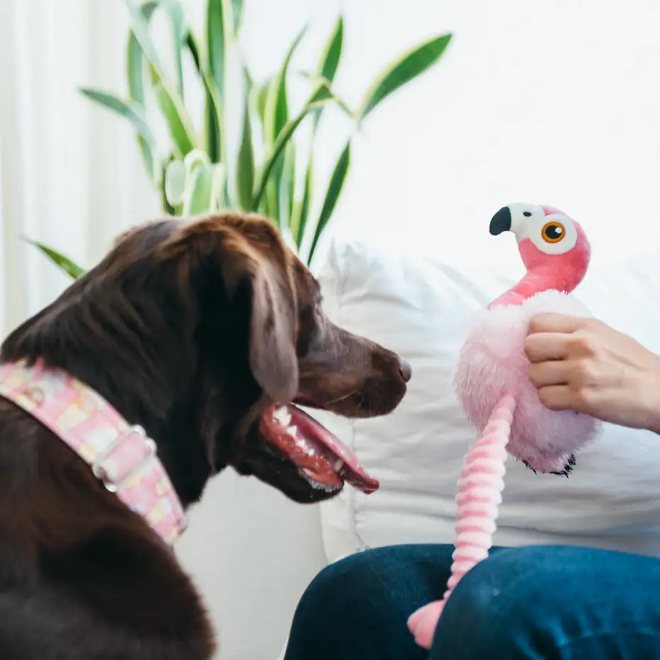 Flap into fun with P.L.A.Y.’s Fetching Flock Flora the Flamingo! This bright and cheerful plush toy is designed to delight dogs of all sizes with its irresistible mix of crinkles, squeaks, and floppy movement. With crinkly legs and two built-in squeakers, Flora brings a tropical twist to tugging, shaking, and interactive play sessions. Whether your pup loves a noisy toy or enjoys carrying a cute feathered friend around the house, Flora is ready to waddle her way into your dog’s heart.
