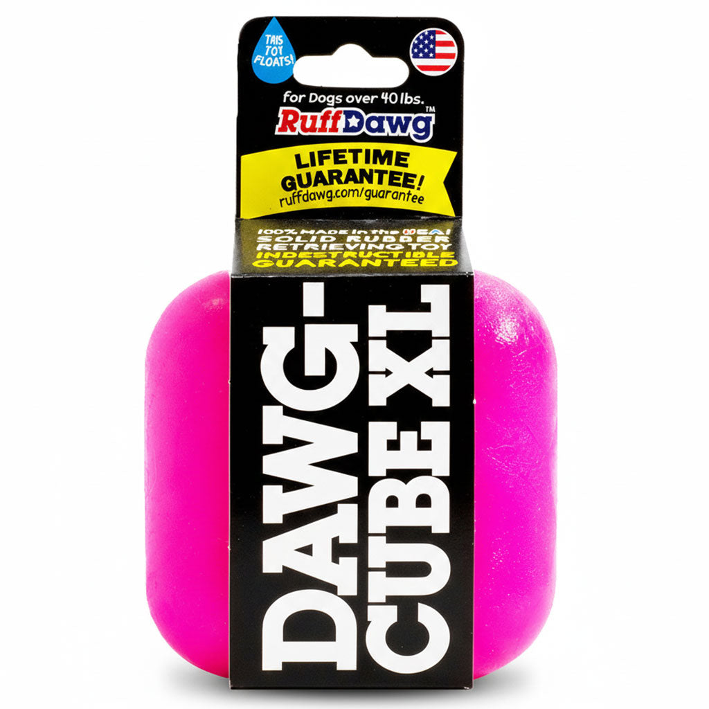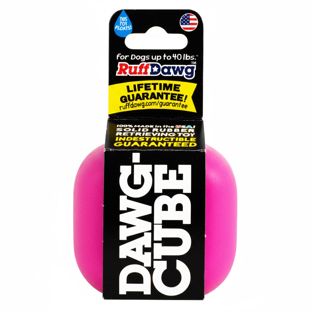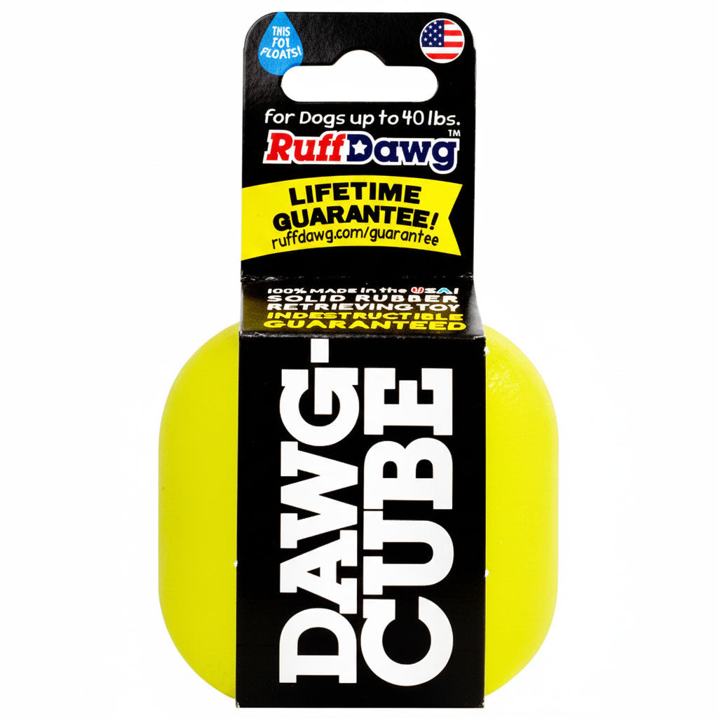 Ruff Dawg Cube - The heavy-duty solid rubber Dawg-Cubes come in 2 sizes and an assortment of bright neon colors. These virtually indestructible toys float and feature a crazy-bounce to activate your dog’s chase and retrieve instinct. They can take serious abuse during heavy play – all while still being gentle on teeth and gums, allowing the retrieving fun to go on and on! Made in the USA.
