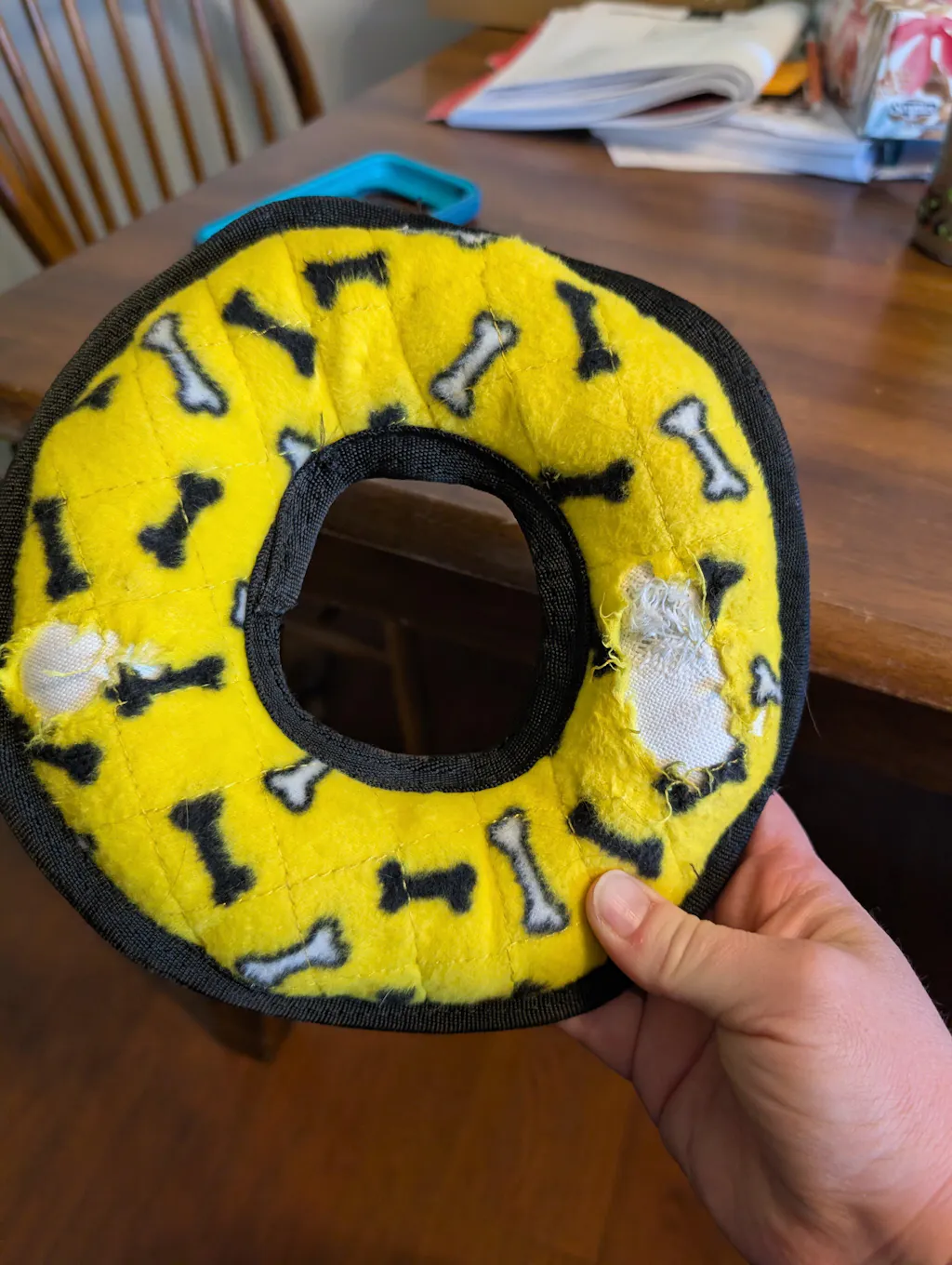 If your dog exposes the white stuffed core, remove the toy immediately to prevent ingestion. Loose threads should also be cut off promptly.